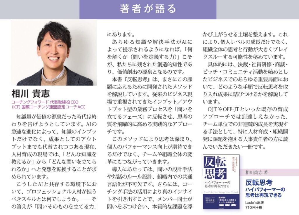 このたび、大手・上場企業4000社が購読する人事メディア「日本人材ニュース」において、弊社代表取締役の相川貴志が取材を受け、著書『反転思考』の記事が公開されました。